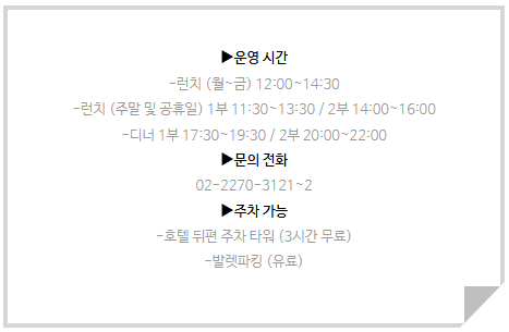 호텔 뒤편의 주차 타워를 이용하면 3시간 무료 주차가 가능하고, 발렛파킹은 유료랍니다.